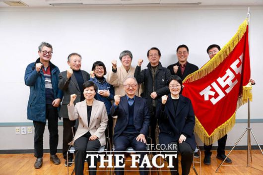 윤희숙 진보당 상임대표(아래 맨오른쪽)가 6일 오전 서울시 종로구 진보당 중앙당사에서 열린 원로들과의 간담회에서 기념사진을 촬영하고 있다./진보당 |