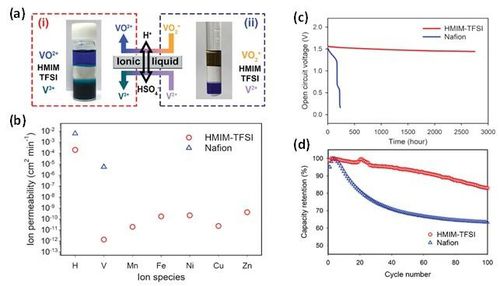 공동연구팀은 바나듐의 투과성은 낮추면서도, 이온전도도와 전기화학적 안정성을 높일 수 있는 분리막 소재로 이온성 액체를 사용했다. 이 액체는 긴 탄소 사슬을 가지는 양이온과 약 염기성 음이온으로 이루어진 양이온-음이온 복합체다.