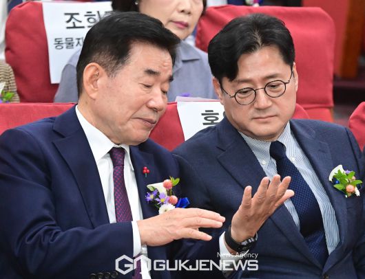 (서울=국제뉴스) 김진표 국회의장과 홍익표 더불어민주당 원내대표가 6일 오전 서울 여의도 국회 의원회관에서 열린 2023 제5회 대한민국 동물복지대상 시상식에서 대화를 하고 있다./사진=이용우기자