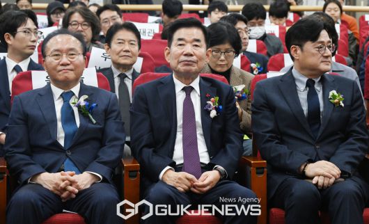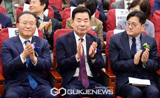 (서울=국제뉴스) 김진표 국회의장과 윤재옥 국민의힘 원내대표, 홍익표 더불어민주당 원내대표가 6일 오전 서울 여의도 국회 의원회관에서 열린 2023 제5회 대한민국 동물복지대상 시상식에 참석해 앉아 있다./사진=이용우기자