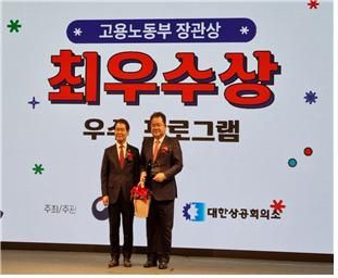 6일 열린 ‘2023 미래내일 일경험 컨퍼런스’에서 일경험 프로그램 부문 최우수상을 받은 유창경 항공우주산학융합원장〈오른쪽〉과 이정식 고용노동부 장관. |