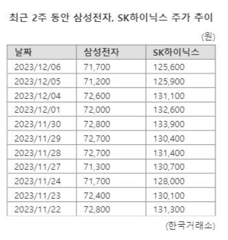 6일 한국거래소에 따르면 최근 2주 동안 삼성전자와 SK하이닉스의 주가는 각각 1.51%, 4.85% 하락했다.