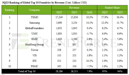 트렌드포스는 3분기 파운드리 상위 10개사 매출이 282억9000만달러로 전분기보다 7.9% 증가했다고 6일 밝혔다.
