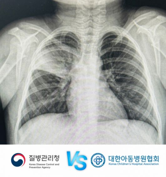 대한아동병원협회가 제공한 마이코플라스마 폐렴 어린이 환자의 X선 사진(위쪽). 폐의 큰 구역인 대엽을 침범한 대엽성 폐렴 소견을 보인다. 최근 마이코플라스마 폐렴 환자가 급증한 가운데, 환자 발생 통계 방식을 두고 질병관리청과 대한아동병원협회가 신경전을 벌이고 있다. |