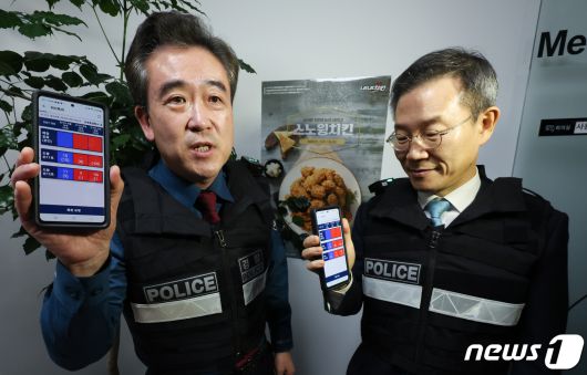 (서울=뉴스1) 허경 기자 = 이종호 과학기술정보통신부 장관(오른쪽)과 윤희근 경찰청장이 6일 서울 도봉구 도봉경찰서 인근 건물에서 피의자가 스토킹 피해자를 건물 내부에 감금한 후 도주한 상황을 가정해 피해자를 구조하고 용의자를 검거하기 위한 디지털 기반 주요 기술을 시연하고 있다. 112 신고자의 위치를 건물 단위까지 파악할 수 있도록 거리 오차를 기존 50m에서 10m 수준으로 줄인 위치 추적 기술이 나온다. 또 용의자 이미지만 넣으면 폐쇄회로(CC)TV 등을 활용해 자동 추적하는 기술도 개발된다. 경찰청과 과학기술정보통신부는 디지털 기반 범죄 안전 강화를 위해 '과학치안 구현과 치안산업 진흥 협력을 위한 업무협약서'를 개정했다고 밝혔다. 2023.12.6/뉴스1