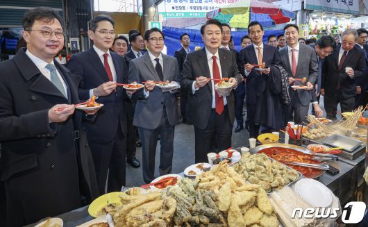 윤석열 대통령이 6일 부산 중구 깡통시장을 방문해 박형준 부산시장과 이재용 삼성전자 회장, 구광모 LG그룹 회장, 조현준 효성그룹 회장, 김동관 한화그룹 부회장, 최재원 SK수석부회장 등 기업총수들과 함께 떡볶이, 튀김, 빈대떡을 맛보고 있다. 2023.12.6/뉴스1 ⓒ News1 부산사진공동취재단 |