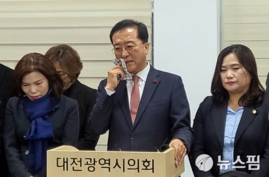 6일 대전 민주당 유성을 시의원인 조원휘(유성3)·이금선(유성4) 의원을 비롯해 유성을 지역 구의원과 지역위원장들이 대전시의회에서 기자회견을 열고 동반 탈당을 선언했다.