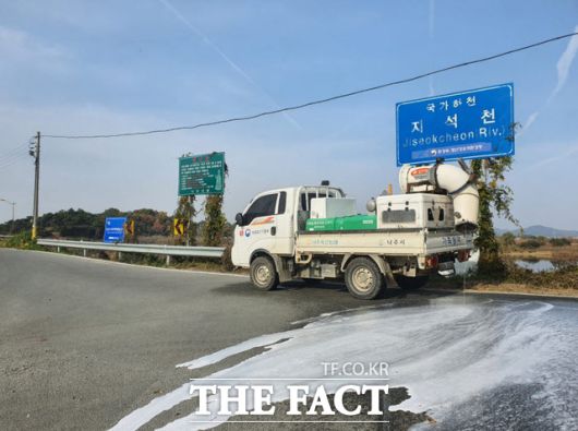 전남도가 무안군 육용오리 농장에서 H5형 조류인플루엔자(AI) 항원이 검출됨에 따라 초동방역팀 2명을 투입해 방역 조치 등에 나섰다. 사진은 나주 지석천 소독 장면이다./무안=홍정열 기자 |