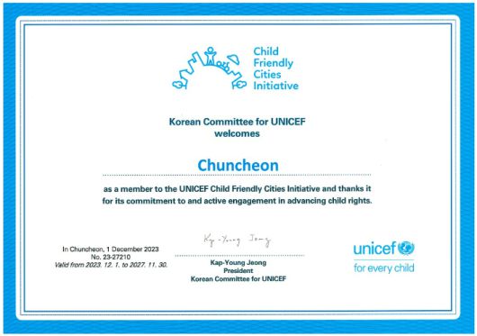 춘천시에 따르면 유니세프 한국위원회는 최근 춘천을 아동친화도시로 인증했다. 유니세프 한국위원회는 아동친화도시 10개 구성요소에 대한 평가를 통해 아동친화도시로 인증하고 있으며 인증 기간은 4년이다.