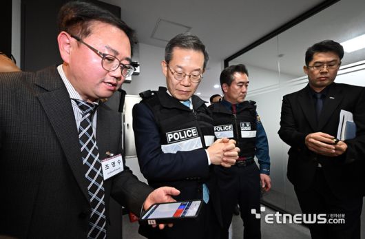 디지털 범죄안전 관계기관 협력강화 행사가 6일 서울 도봉구 도봉경찰서에서 열렸다. 이종호 과학기술정보통신부 장관(왼쪽에서 두 번째)과 윤희근 경찰청장(“ 세 번째)이 네트워크 신호정보를 활용한 긴급구조 정밀측위 기술에 대해 설명듣고 있다. 이동근기자 foto@etnews.com [Copyright © 전자신문. 무단전재-재배포금지]