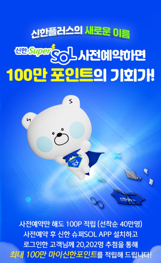 사전 예약 후 오는 31일까지 신한 슈퍼SOL 애플리케이션을 설치하고 로그인한 고객을 대상으로 2만202명을 추첨, 마이신한포인트 100만 포인트, 캐릭터 골드바 1g, 1000 마이신한포인트를 추첨해 제공할 계획이다.