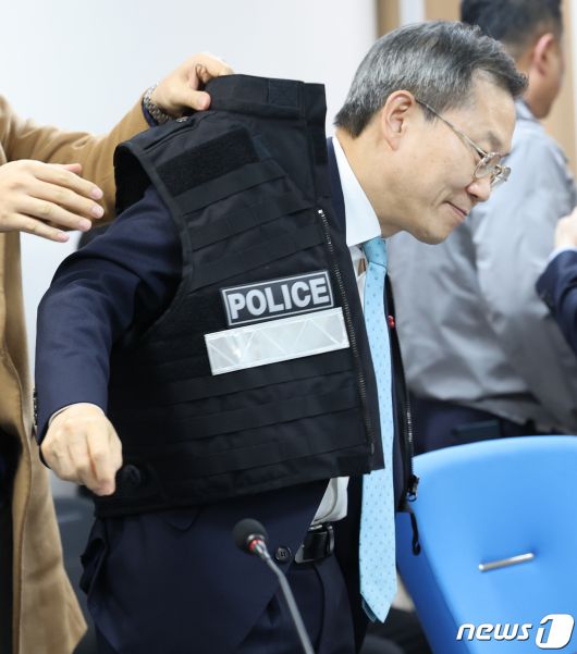 (서울=뉴스1) 허경 기자 = 이종호 과학기술정보통신부 장관이 6일 서울 도봉구 도봉경찰서에서 ‘디지털 기반 범죄예방 강화방안’을 발표한 뒤 주요 치명상 부위 등에 방검소재를 적용하고 신체 밀착을 통한 무게 분산 등 편의성이 향상된 차세대 방검 외근조끼를 착용하고 있다. 112 신고자의 위치를 건물 단위까지 파악할 수 있도록 거리 오차를 기존 50m에서 10m 수준으로 줄인 위치 추적 기술이 나온다. 또 용의자 이미지만 넣으면 폐쇄회로(CC)TV 등을 활용해 자동 추적하는 기술도 개발된다. 경찰청과 과학기술정보통신부는 디지털 기반 범죄 안전 강화를 위해 '과학치안 구현과 치안산업 진흥 협력을 위한 업무협약서'를 개정했다고 밝혔다. 2023.12.6/뉴스1