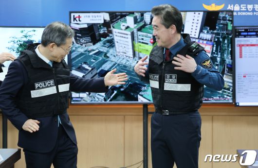 (서울=뉴스1) 허경 기자 = 이종호 과학기술정보통신부 장관(왼쪽)과 윤희근 경찰청장이 6일 서울 도봉구 도봉경찰서에서 ‘디지털 기반 범죄예방 강화방안’을 발표한 뒤 주요 치명상 부위 등에 방검소재를 적용하고 신체 밀착을 통한 무게 분산 등 편의성이 향상된 차세대 방검 외근조끼를 착용하고 있다. 112 신고자의 위치를 건물 단위까지 파악할 수 있도록 거리 오차를 기존 50m에서 10m 수준으로 줄인 위치 추적 기술이 나온다. 또 용의자 이미지만 넣으면 폐쇄회로(CC)TV 등을 활용해 자동 추적하는 기술도 개발된다. 경찰청과 과학기술정보통신부는 디지털 기반 범죄 안전 강화를 위해 '과학치안 구현과 치안산업 진흥 협력을 위한 업무협약서'를 개정했다고 밝혔다. 2023.12.6/뉴스1