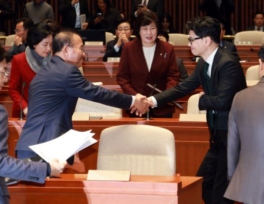 한동훈 법무부 장관(오른쪽)과 국민의힘 윤재옥 원내대표가 6일 국회 예결위회의장에서 열린 국민의힘 정책의원총회에서 악수하고 있다.(사진=연합뉴스 제공) |