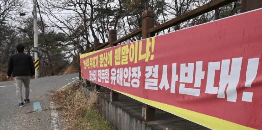 6일 경기도 파주시 문산읍 장산리에 고(故) 전두환씨의 유해 안장을 반대하는 플래카드가 걸려 있다. 2년째 서울 연희동 자택에 임시 안치 중인 전 전 대통령의 유해는 파주 장산리의 한 사유지에 안장될 예정이었으나, 파주 시민들의 반대로 무산됐다.