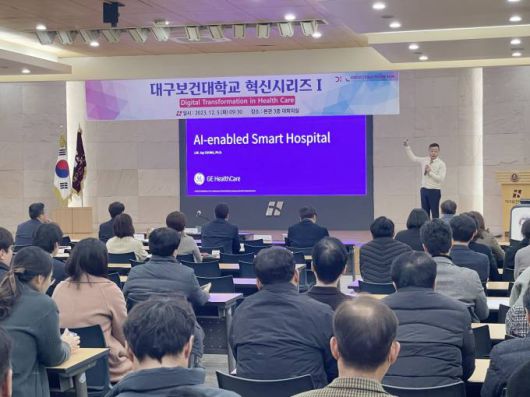 행사를 주관한 글로컬미래융합대학지원단 김정수(50·방사선학과 교수) 단장은 “지속가능한 보건의료 기술교육 혁신을 위해 대학의 교육 전반에 새로운 방식인 디지털 트렌스포메이션과 인공지능 헬스케어를 어떻게 활용하고 접목하는지가 우수한 보건의료기술 인재 양성의 시작이라 생각한다”며 “대구보건대가 글로컬 대학으로 도약키 위한 혁신시리즈 강의를 지속적으로 진행해 졸업생들이 보건의료산업 현장에서 실무형 인재로 중추적인 역할을 할 수 있도록 최선을 다하겠다”고 말했다.
