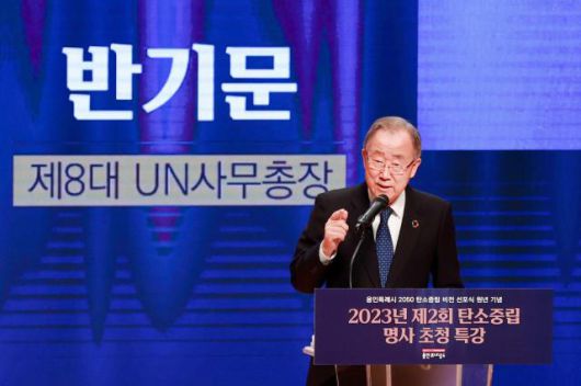 반기문 전 유엔 사무총장이 지난 5일 경기 용인특례시 에이스 홀에서 열린 제2회 탄소중립 명사 초청 특강을 통해 기후위기 극복의 중요성을 강조했다.