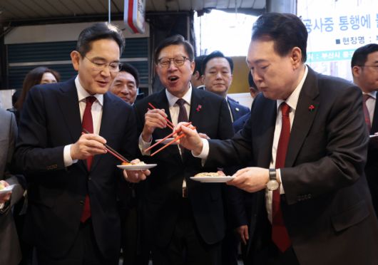 ▲윤석열 대통령이 6일 부산 중구 깡통시장에서 이재용 삼성전자 회장에게 빈대떡을 건네고 있다. ⓒ연합뉴스 |