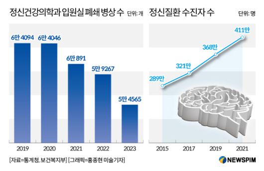 복지부는 중증 정신질환 당사자 치료를 위해 응급 진료 체계를 구축할 예정이다. 올해 139병상인 정신응급병상을 시군구당 최소 1병상씩 확보하는 식이다. 정신건강의학과 병원을 찾는 환자가 해마다 늘고 있는 반면 이들이 입원할 수 있는 병상은 오히려 감소하고 있기 때문이다.