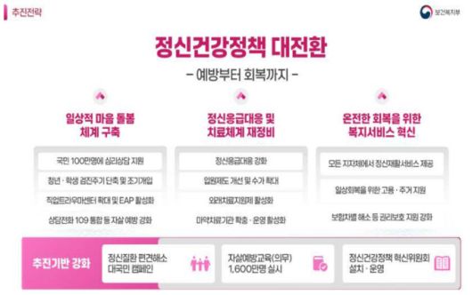 보건복지부는 이를 위해 국민의 정신건강을 예방부터 회복까지 국가가 책임지는 '정신건강정책 혁신방안'을 발표했다.
