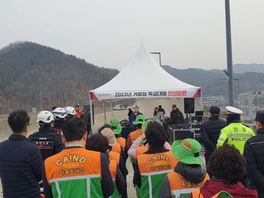 (대전=국제뉴스) 이규성 기자 = 대전시는 겨울철 폭설에 효율적으로 대처하기 위해 6일 오후 서구 구봉로 정림대교에서 '2023년 겨울철 폭설대응 현장훈련'을 실시했다고 밝혔다.