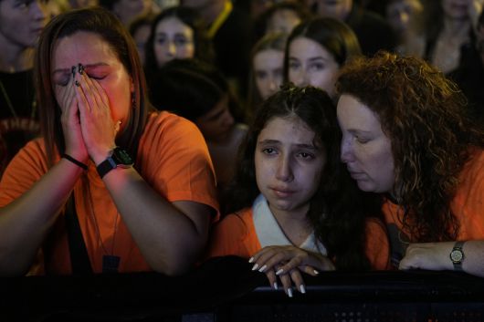 | 여성들이 가자지구에 억류된 것으로 추정되는 인질들의 사진을 보고 있다 / AP = 연합뉴스 |