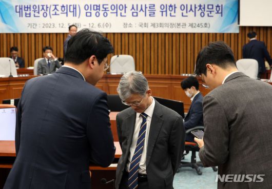[서울=뉴시스] 이영환 기자 = 조희대 대법원장 후보자가 6일 오전 서울 여의도 국회에서 열린 인사청문회에 참석해 관계자들과 대화를 하고 있다. 2023.12.06. 20hwan@newsis.com |