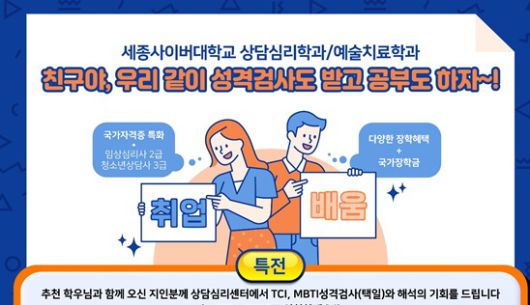 [문화뉴스 김예품 기자] 세종사이버대학교(총장 신구) 상담심리학과와 예술치료학과에서는 재학생의 지인들에게 학과의 장점을 알리고 편입학을 추천하는 이벤트로 '친구야, 우리 같이 성격검사도 받고, 공부도 하자'를 진행하고 있다고 6일 밝혔다.