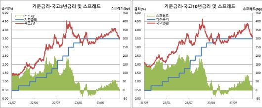 한은 기준금리와 국고3년물 및 국고50년물간 금리차는 각각 마이너스(-)3.7bp와 -11.4bp를 기록해 역전폭이 확대됐다. 국고10년물과도 3.3bp로 좁혀졌다.