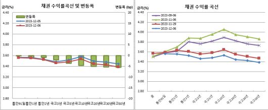6일 채권시장과 금융투자협회에 따르면 통안2년물은 0.9bp 하락한 3.522%를 국고3년물은 2.1bp 떨어진 3.463%를 기록했다. 이는 각각 6월2일(3.522%, 3.436%) 이후 최저치다. 국고4년물도 3.6bp 떨어진 3.482%를 보여 기준금리를 밑돌았다. 이는 6월7일(3.449%) 이후 가장 낮은 수준이다.