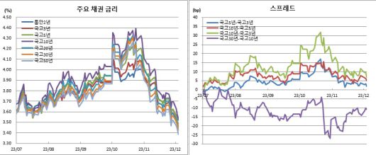 이어 “최근 시장특징은 내년 1월을 올해 11월 내지 12월초로 당긴 느낌이라는 것이다. 아무래도 작년말부터 연초까지 채권 없던 기관들이 급격한 장세에 재미를 보지 못한 학습효과로 보인다”며 “이렇게 되면 오히려 내년 1월이 연초라는게 무색할 정도로 재미없을 수 있겠다. 이미 크레딧 스프레드는 단기간에 상당폭 붙어 메리트가 많이 줄었다. 물가라든지 미국장 금리 급락 등으로 롱재료가 많은 것은 사실이나 시장이 너무 쏠려가는 것은 아닌지 주의가 필요할 수도 있다는 판단이다. 환율이 1300원 위로 다시 올라온 가운데 아직은 잠잠한 유가가 다시 80달러 위로 올라가거나 하는 재료가 나오면 내년 인하 기대보다는 추가 인상으로 뷰가 바뀔 가능성을 아예 배제할 수 없다. 급한 숏커버가 11월 중순 이후 급격하게 유입된 후 조정타이밍에 대한 고민도 필요한 시점이라 판단된다”고 진단했다.