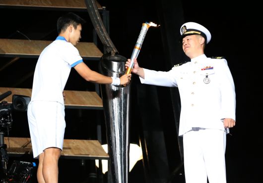 윤석열 대통령이 6일 신임 국가보훈부 차관으로 제2연평해전 승전의 주역인 이희완 해군 대령을 임명하면서 화제가 되고 있다. 사진은 지난 2015년 10월 경북 문경 세계군인체육대회 개막식에서 성화 봉송에 참여한 이희완 당시 소령이 대한민국 축구대표 이정엽으로부터 성화를 전달받는 모습. [연합] |