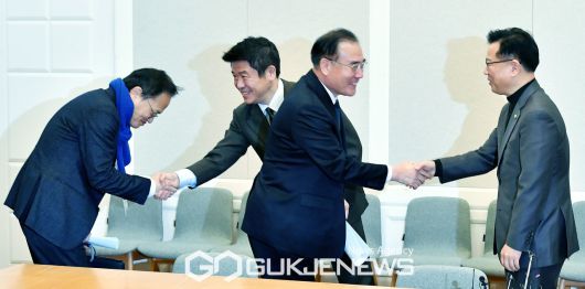(서울=국제뉴스) 유의동(왼쪽 두 번째) 국민의힘 정책위의장과 이개호(오른쪽 두 번째) 더불어민주당 정책위의장이 6일 오후 서울 여의도 국회에서 열린 여야 2+2 합의체 회의에서 더불어민주당 박주민(왼쪽) 원내수석부대표, 이양수(오른쪽) 국민의힘 원내수석부대표와 각각 인사를 나누고 있다./사진=이용우기자