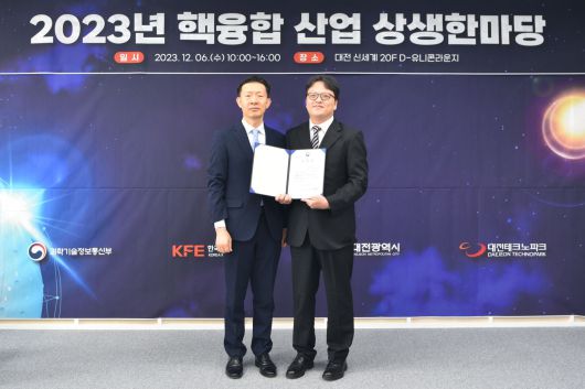 ■과학기술정보통신부는 한국핵융합에너지연구원, 대전광역시와 함께 ‘2023년 핵융합 산업 상생한마당’ 행사를 개최했다고 밝혔다. 이번 행사는 핵융합 분야 산업체의 시장 확대와 판로개척을 지원하고, 산업 생태계 활성화, 상생을 위한 소통의 장을 만들기 위해 열렸다. 사전 행사에서는 대전지역 핵융합 기술사업화 활성화를 위한 핵융합연-대전시-대전 테크노파크(TP) 간 3자 업무협약 체결이 진행됐다. 본 행사에서는 핵융합연의 남용운 플라즈마진단연구팀장, 효성중공업이 과학기술정보통신부 장관 표창도 받았다.