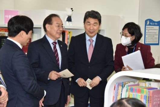 하윤수 부산시교육감(왼쪽 두 번째)이 이주호 부총리(오른쪽 두 번째)와 6일 오후 야간 긴급 돌봄서비스를 제공하는 구포돌봄센터를 방문해 운영 현황을 점검하고 있다.[사진=부산시교육청] 2023.12.06. |
