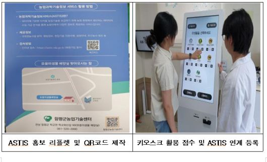 함평군농업기술센터는 농업용 유용 미생물을 비대면으로 보급하는 무인안내기(키오스크)와 애즈티스 시스템 프로그램을 연동해 농업인별 미생물 분양 실적을 자동 등록되도록 했다. 이러한 정보는 관내 농업인 대상 미생물 사용 교육의 기초자료로 활용하고 있다.