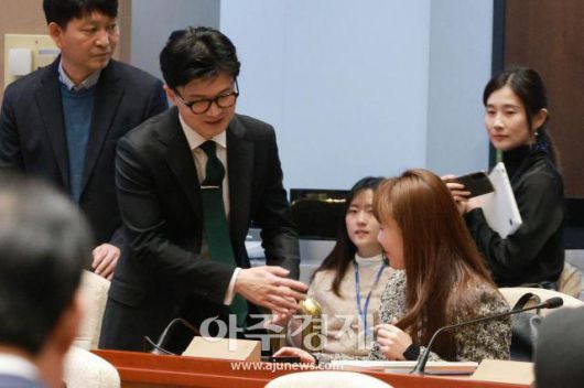 한동훈 법무부 장관(왼쪽)과 김예지 국민의힘 최고위원이 6일 오후 서울 여의도 국회에서 열린 국민의힘 정책의원총회에서 악수를 나누고 있다. 2023.12.06