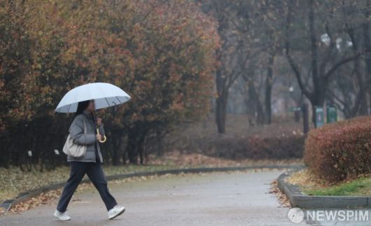 [서울=뉴스핌] 최지환 기자 = 6일 오후 서울 영등포구 여의도공원에서 시민들이 우산을 쓰고 이동하고 있다. 2023.12.06 choipix16@newspim.com