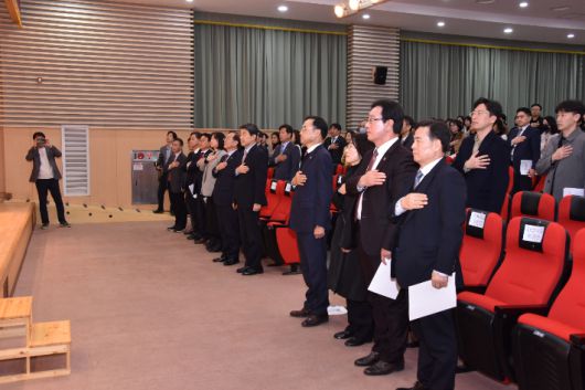 이주호 장관과 하윤수 부산시교육감 등이 교육특구 설명회에 앞서 국민의례를 하고 있다. 부산시교육청 제공 |