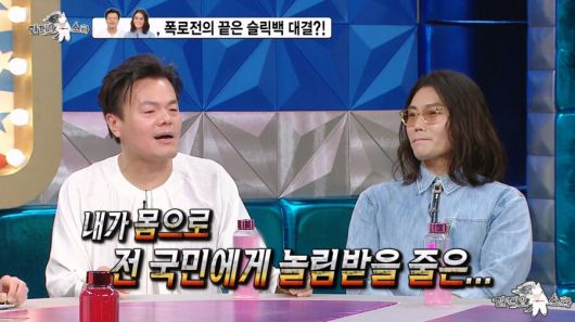 그런가 하면, 김범수가 박진영의 ‘슬릭백’ 챌린지에 도전하는 모습이 이어졌다. ‘슬릭백’ 이야기가 나오자마자, 박진영은 화제가 됐었던 자신의 슬릭백 챌린지 영상에 대해 "정말 (영상을) 내리고 싶다. 그런데 갑자기 내리면 모양 빠지니까 내릴 수도 없고. 내가 몸으로 전 국민에게 놀림당할 줄은 (몰랐다). 내가 이제 ‘깡’ 비의 마음을 알겠어”라고 전 국민의 조롱을 받게 된 심경을 고백해 폭소를 선사한다.