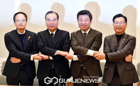 (서울=국제뉴스) 유의동 국민의힘 정책위의장과 이개호 더불어민주당 정책위의장이 6일 오후 서울 여의도 국회에서 열린 여야 2+2 합의체 회의에 참석해 기념촬영을 하고 있다. 왼쪽부터 더불어민주당 박주민 원내수석부대표, 이개호 정책위의장, 국민의힘 유의동 정책위의장, 이양수 원내수석부대표. /사진=이용우기자