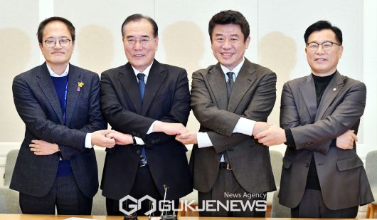 (서울=국제뉴스) 유의동 국민의힘 정책위의장과 이개호 더불어민주당 정책위의장이 6일 오후 서울 여의도 국회에서 열린 여야 2+2 합의체 회의에 참석해 기념촬영을 하고 있다. 왼쪽부터 더불어민주당 박주민 원내수석부대표, 이개호 정책위의장, 국민의힘 유의동 정책위의장, 이양수 원내수석부대표./사진=이용우기자