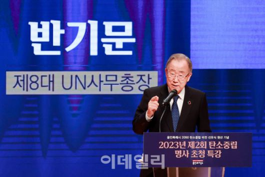 지난 5일 용인특례시청 에이스홀에서 열린 제2회 탄소중립 명사 초청 특강에서다. 6일 경기 용인시에 따르면 반 전 총장은 평소 친분이 두터웠던 이상일 용인특례시장의 초청으로 특강 강사로 참여하게 됐다.
