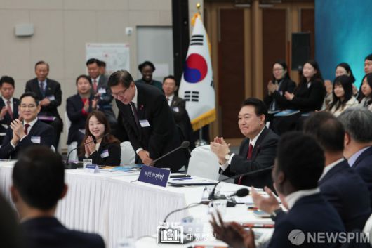 [서울=뉴스핌]윤석열 대통령이 6일 부산 동구 부산항국제전시컨벤션센터에서 열린 '부산시민의 꿈과 도전 간담회'에서 박형준 부산시장에게 박수를 보내고 있다. [사진=대통령실] 2023.12.06 photo@newspim.com 저작권자(c) 글로벌리더의 지름길 종합뉴스통신사 뉴스핌(Newspim), 무단 전재-재배포 금지