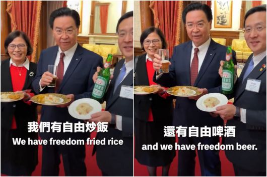 자유의 볶음밥과 맥주가 있다고 강조하는 우자오셰 대만 외교부장(가운데). 대만 외교부 엑스 캡처 |