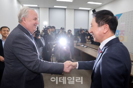 [이데일리 노진환 기자] 김기현 국민의힘 대표와 인요한 혁신위원장이 6일 오후 서울 여의도 국회에서 열린 간담회를 앞두고 악수를 하고 있다.