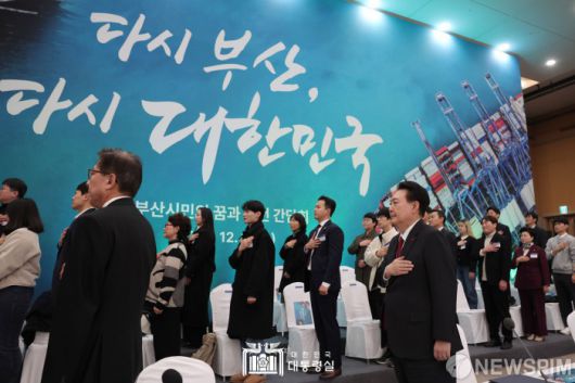 [서울=뉴스핌]윤석열 대통령이 6일 부산 동구 부산항국제전시컨벤션센터에서 열린 '부산시민의 꿈과 도전 간담회'에서 국기에 경례하고 있다. [사진=대통령실] 2023.12.06 photo@newspim.com 저작권자(c) 글로벌리더의 지름길 종합뉴스통신사 뉴스핌(Newspim), 무단 전재-재배포 금지