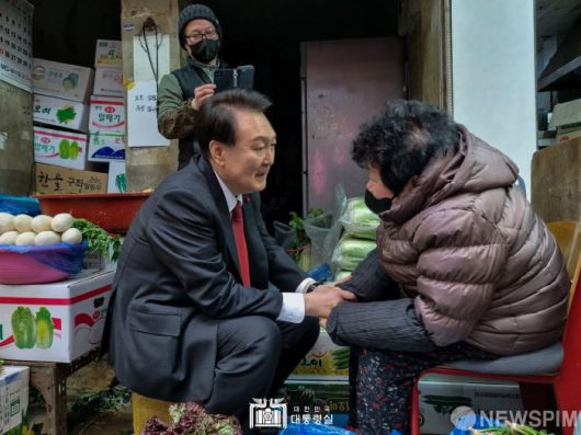 [서울=뉴스핌] 윤석열 대통령이 6일 부산 중구 깡통시장을 방문해 상인을 격려하고 있다. [사진=대통령실] 2023.12.06 photo@newspim.com 저작권자(c) 글로벌리더의 지름길 종합뉴스통신사 뉴스핌(Newspim), 무단 전재-재배포 금지