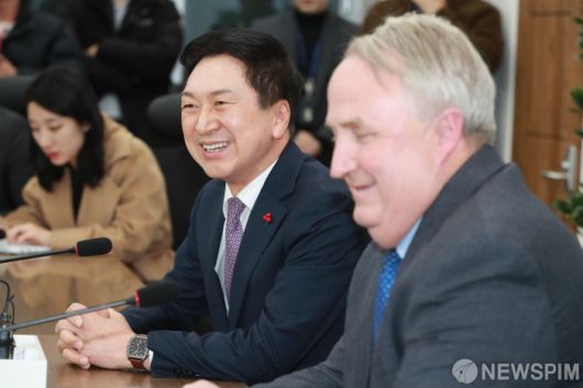 [서울=뉴스핌] 이형석 기자 = 김기현 국민의힘 대표(왼쪽)와 인요한 혁신위원장이 6일 오후 서울 여의도 국회에서 열린 간담회에서 대화를 나누고 있다. 2023.12.06 leehs@newspim.com