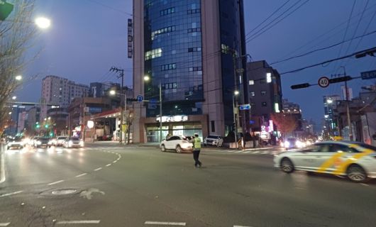 6일 오후 대규모 정전사태가 발생하면서 주요 도로의 신호등 작동이 멈추자 경찰관들이 울산 남구 월평로 교차로에서 수신호를 하며 교통정리를 하고 있다./울산경찰청 제공 |